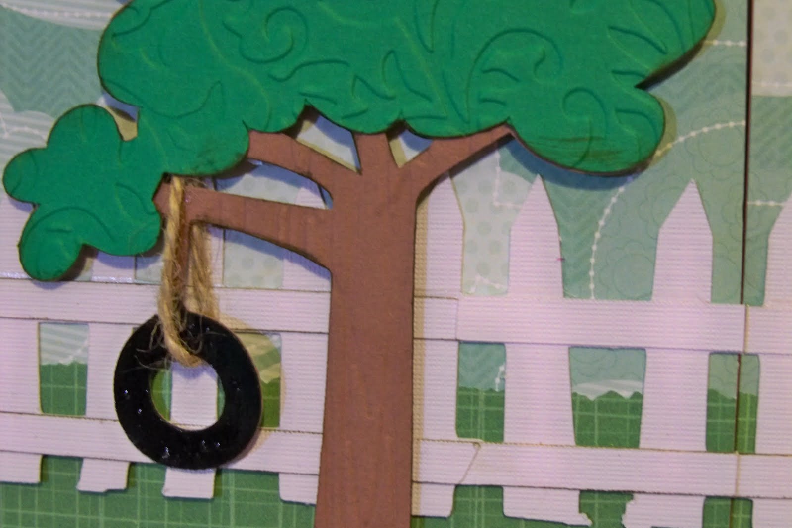 Here's my creation. This is the first time that I just started by drawing a sketch. Normally, I start with my pictures and go from there, but there were so many cuts from this cartridge that I just knew I wanted to use. All of the cuts on here are from pop-up neighborhood. I also used 3 different Cuttlebug embossing folders, diamond glaze (on the tire swing and the lamp post), liquid pearls, pop dots and distressed ink on the images. The paper is primarily DCWV.
